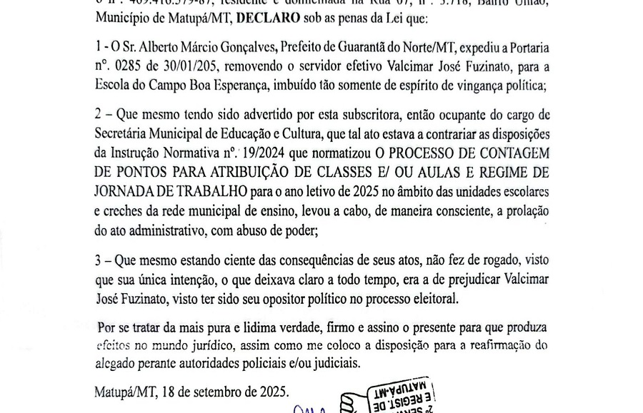 GUARANTÃ DO NORTE Ex-secretária diz que alerta foi ignorado e acusa prefeito de guarantã de usar o cargo para perseguição política. 24/03/2026 - 08:11